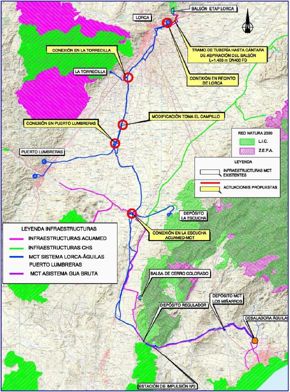 Las obras han consistido, básicamente, en conectar con la red de distribución de la balsa de Cerro Colorado de la Sociedad Acuamed que se suministra de la desaladora de Águilas y a su vez conectar con una de las dos conducciones existentes de la Mancomunidad para el abastecimiento al municipio de Águilas que ha sido acondicionada para permitir su funcionamiento reversible y, por último, la conexión en el recinto de Lorca para permitir entregar en la ETAP de Lorca.