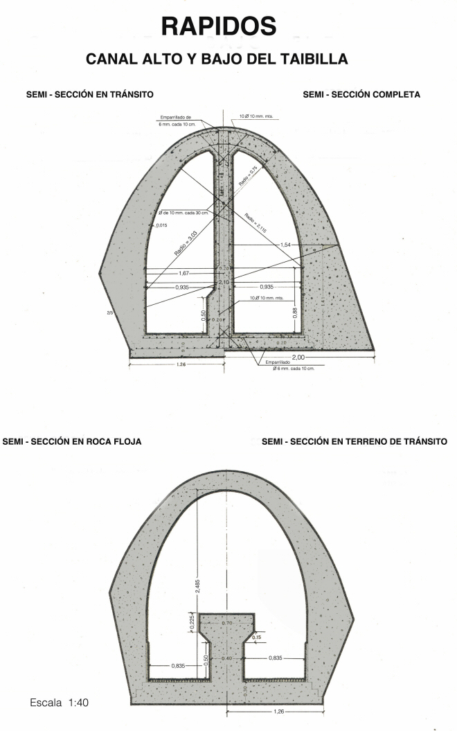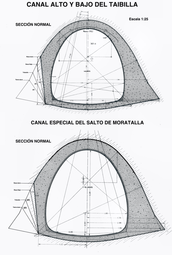 Esta página presenta dibujos de las secciones tipo de los canales Alto y Bajo del Taibilla. En ambos casos las secciones se han construido de forma idéntica. Para visualizar un dibujo con mayor nivel de detalle sólo tiene que hacer clic sobre él (el dibujo se ampliará en una nueva ventana).
