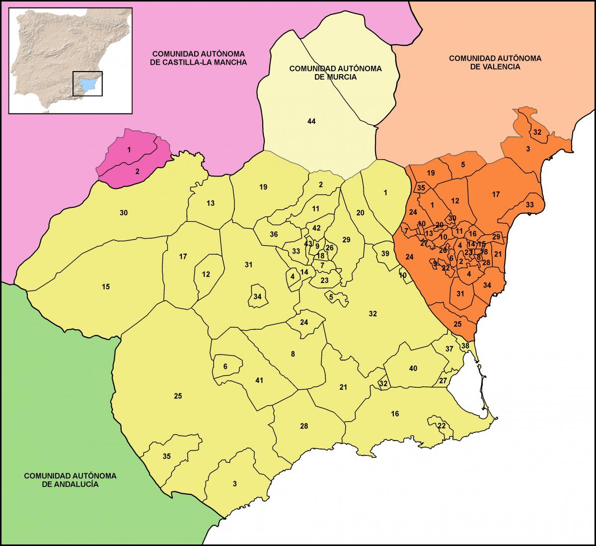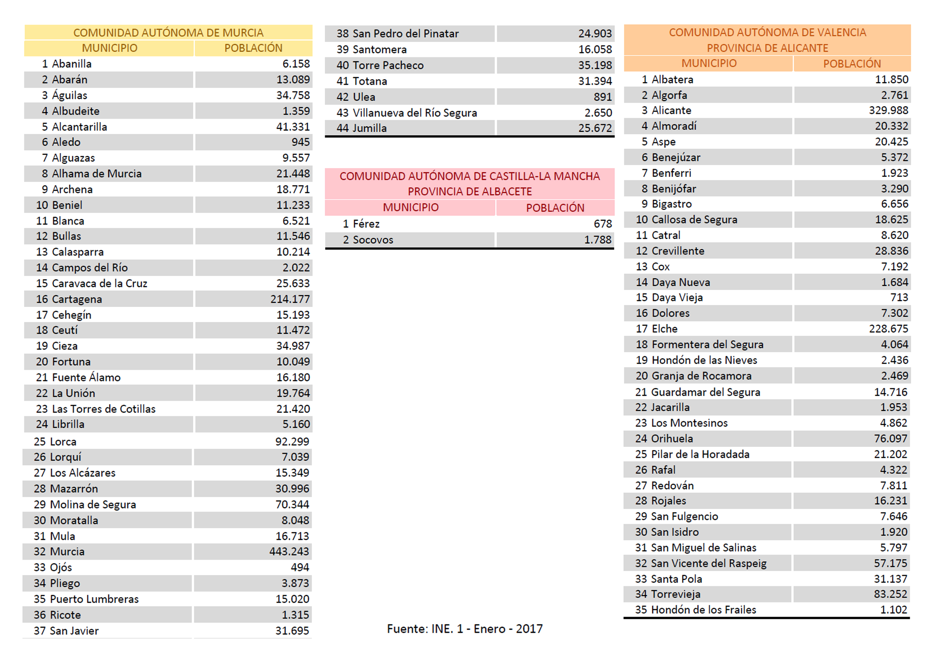 Actualmente la Mancomunidad abastece de agua a 80 municipios, de los que 43 pertenecen a la provincia de Murcia, 35 a la provincia de Alicante y 2 a la provincia de Albacete. A continuación se presenta el mapa de abastecimiento para Albacete y Murcia, así como para Alicante. Las áreas sin numerar no están mancomunadas (es decir, no pertenecen a municipios integrados en la Mancomunidad). Las áreas 44 de Murcia y 35 de Alicante pertenecen a municios que han solicitado la integración. El resto del mapa pertenecen a municipios mancomunados.
