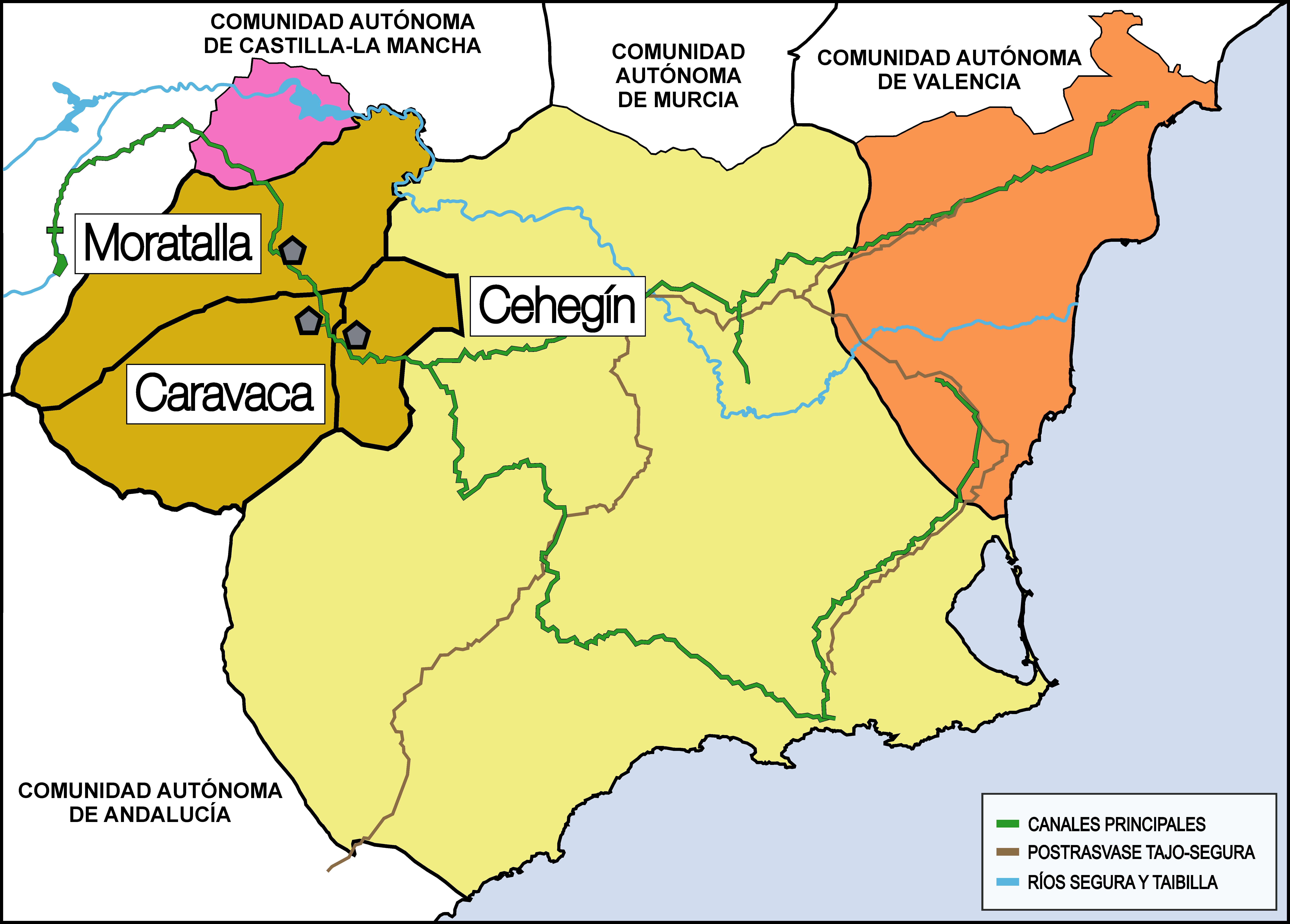 Noroeste Comarca atravesada por los Canales Alto y Bajo, tramos iniciales del canal general del Taibilla, cuya proximidad propició que Cehegín y Moratalla fueran abastecidos con anterioridad a Caravaca de la Cruz. Los saltos hidroeléctricos de las Murtas y Moratalla, con un desnivel conjunto de 130 m, constituyen sus más notables singularidades.