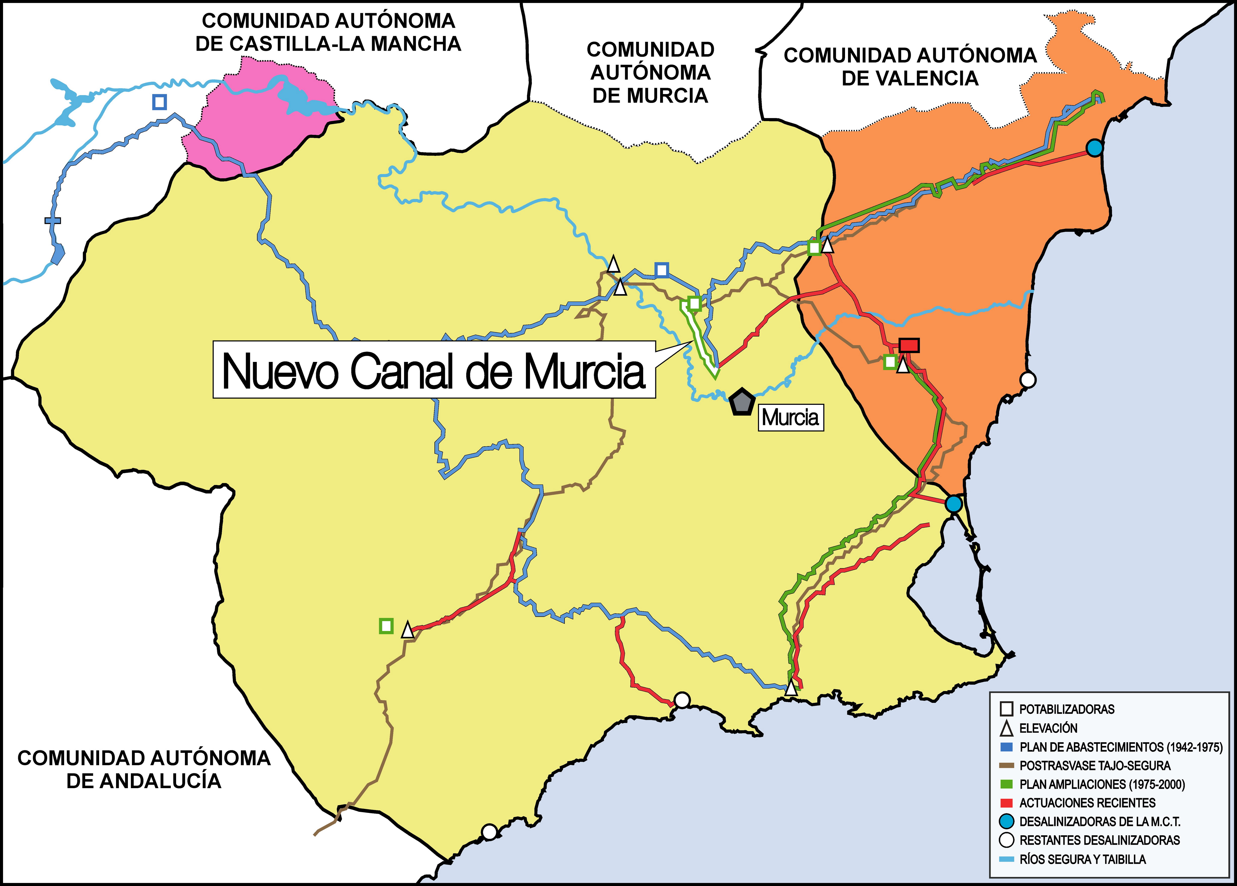 Este canal se inicia en el km 55 del canal del Segura (final del trozo 3º) y discurre con dirección Sur hasta los depósitos de regulación de Murcia (en Espinardo). En realidad se trata de un canal prácticamente paralelo al antiguo canal de Murcia (consulte la página del Canal de Murcia para obtener más información). A continuación puede ver las carcterísticas técnicas del canal.