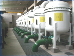 - Filtración a presión sobre lecho de arena silícea en filtro cerrado: 12 filtros de diámetro 3.600 mm y 12.500 mm de longitud