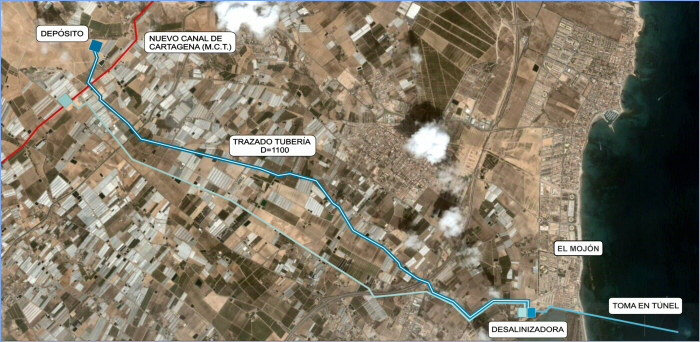 Cinco grupos motobombas (uno de reserva), con una altura de elevación de 90 metros, permiten aportar al Nuevo Canal de Cartagena, a través del depósito regulador, el volumen de agua dulce producido (65.000 m3 diarios) por medio de una conducción de impulsión de 1.100 mm de diámetro y 8 km de longitud.